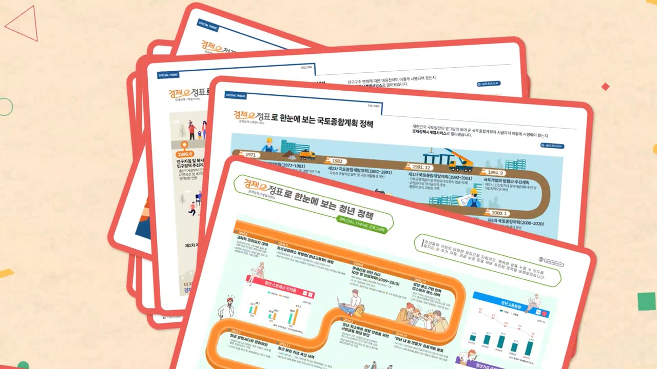 방대하고 복잡한 국가 경제 지표와 정책 데이터들을 일반 시민들도 직관적으로 이해할 수 있도록 '이정표'라는 메타포를 활용해 시각화했습니다. 신뢰감을 주는 블루 톤의 컬러 팔레트와 정교한 인포그래픽 모션을 통해, 정보의 권위는 유지하되 전달 방식은 친절하고 트렌디하게 풀어내어 공공기관 콘텐츠의 새로운 기준을 제시했습니다.